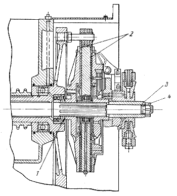Регулировка главной муфты. Главная муфта (рис. 134) расположена в коробке, прикрепленной к картеру дизеля. При включенном положении она должна передавать полный крутящий момент дизеля без пробуксовки до заглушения, а при выключенном положении безотказно, полностью выключать трансмиссию экскаватора. При необходимости главную муфту регулируют под нагрузкой, затягивая гайку на торцо вала таким образом, чтобы при резком повышения нагрузки и снижении числа оборотов двигателя до 600 об/мин муфта проскальзывала. Ориентировочно это соответствует положению гайки на 0,5—1,5 оборота до полной затяжки. После регулировки гайку следует застопорить. Рис. 134. Регулировки главной муфты экскаватора Э-052. |